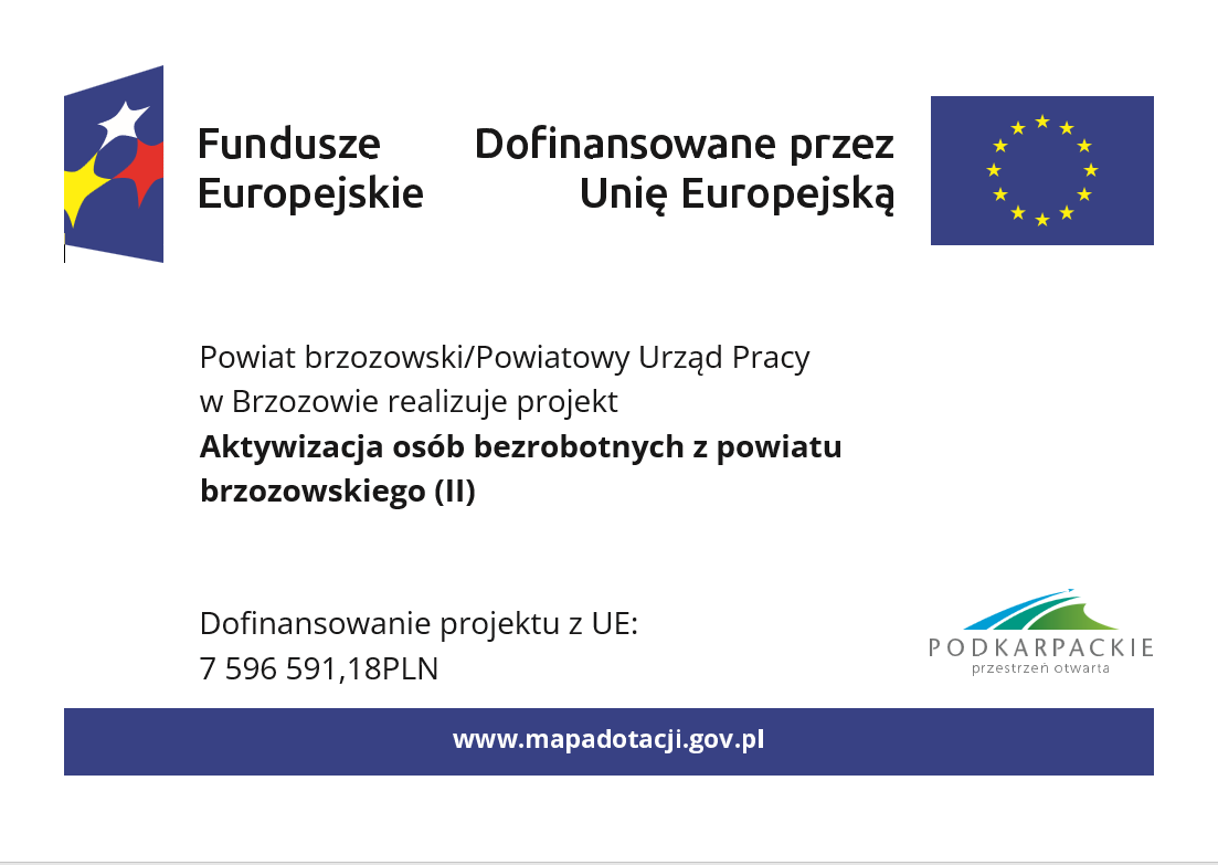 Powiatowy Urząd Pracy w Brzozowie informuje o zwiększeniu wartości realizacji projektu niekonkurencyjnego współfinansowanego z Europejskiego Funduszu Społecznego Plus pn.: „Aktywizacja osób bezrobotnych z powiatu brzozowskiego (II)" w ramach programu regionalnego Fundusze Europejskie dla Podkarpacia 2021-2027, Priorytet 7 Działanie FEPK.07.01 Aktywizacja zawodowa osób pozostających bez pracy – realizowanego w latach 01.01.2024 – 31.12.2025 do kwoty 7 596 591,18 PLN z czego dofinansowanie UE wynosi 6 457 102,49 PLN