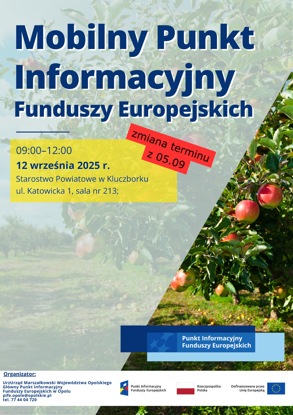 Mobilny Punkt Informacyjny funduszy europejskich odbędzie się w Starostwie Powiatowym w Kluczborku 12 września 2025 r., w godz. 9:00-12:00.