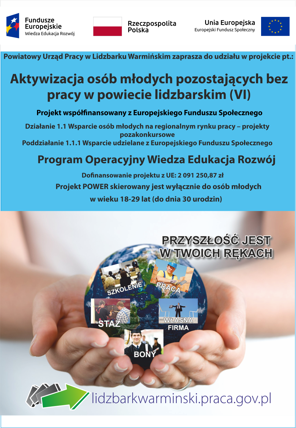 Projekt pt.: „Aktywizacja osób młodych pozostających bez pracy w powiecie lidzbarskim (VI)". Cel projektu: Zwiększenie możliwości zatrudnienia osób młodych do 29 roku życia pozostających bez pracy w powiecie lidzbarskim.
