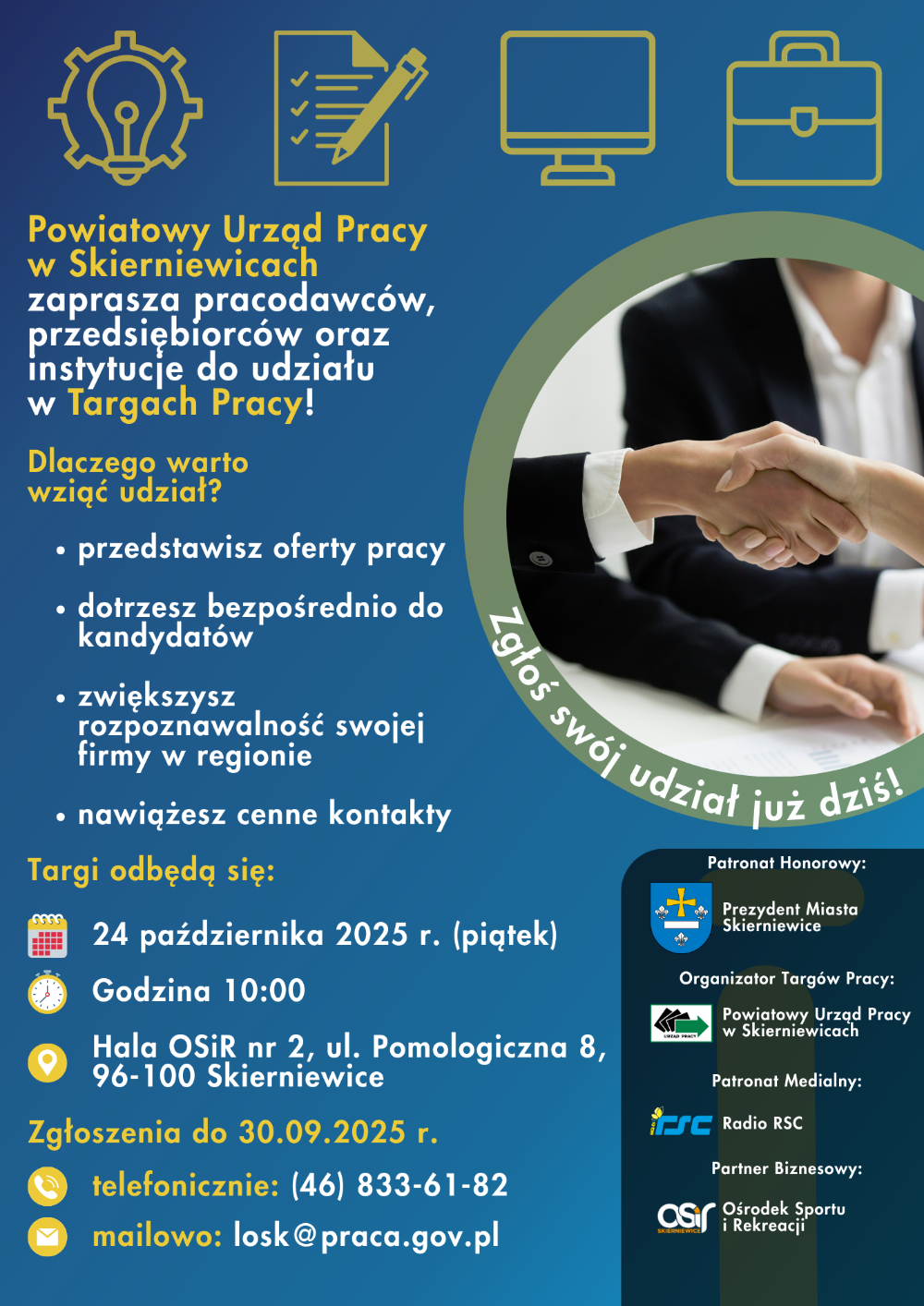 Targi Pracy odbędą się 24 października 2025 r. w godzinach 10:00 do 14:00 w Ośrodku Sportu i Rekreacji w Skierniewicach, ul. Pomologiczna 8, 96-100 Skierniewice – Hala nr 2.