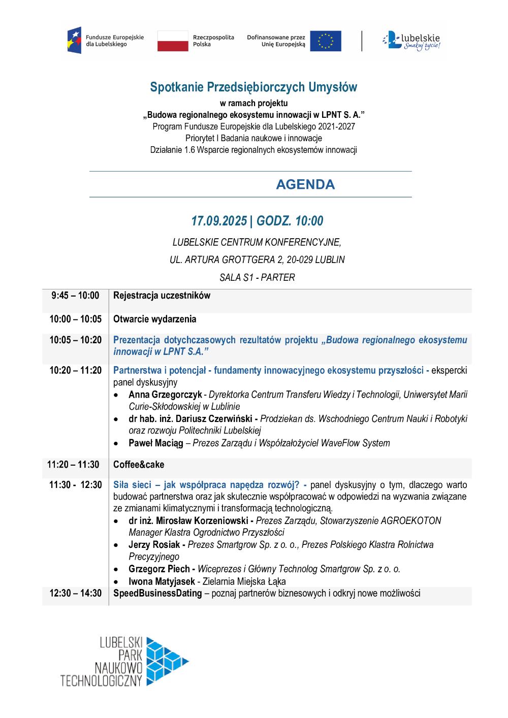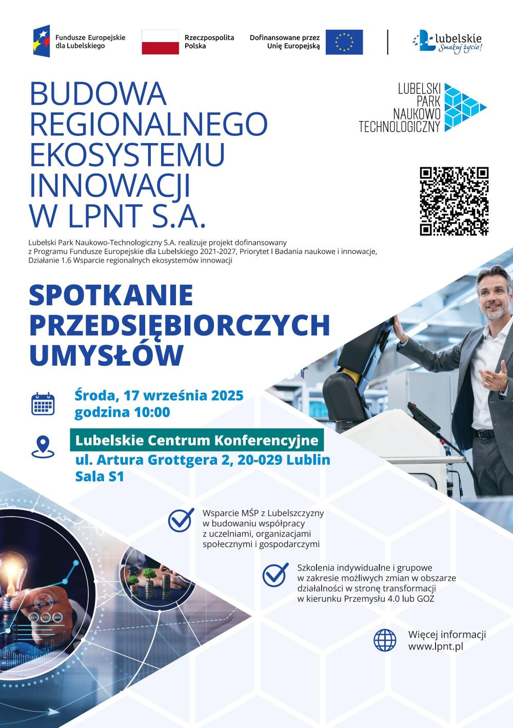 Lubelski Park Naukowo-Technologiczny S.A. zaprasza na Spotkanie Przedsiębiorczych Umysłów, organizowane w ramach projektu „Budowa regionalnego ekosystemu innowacji w LPNT S.A.", współfinansowanego z Funduszy Europejskich dla Lubelskiego 2021-2027.